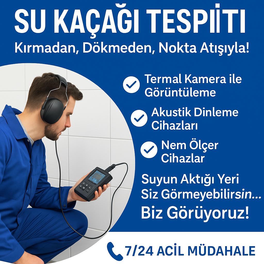 Su Kaçağı Tespiti Evlerde, iş yerlerinde ya da tesislerde meydana gelen su kaçakları; fark edilmediği sürece duvarlarda rutubet, tavanlarda leke, kötü koku, fatura artışı ve hatta yapısal zararlara yol açabilir. İşte tam bu noktada biz devreye giriyoruz! Su kaçağı tespiti, sıradan bir “bakalım nereden geliyormuş” işi değildir. Gözle görülmeyen, içeriden süzülen ya da ince bir damlama halinde devam eden kaçaklar ancak uzman cihazlar ve deneyimli ustalıkla bulunabilir.Nasıl Çalışıyoruz?Termal Kamera ile Görüntüleme: Sıcaklık farklılıklarını anında tespit eder, boruların içindeki akışı duvar arkasından görüntüleyebiliriz.Akustik Dinleme Cihazları: Kaçağın sesini duvar arkasından dinleyerek noktasal konumunu belirleriz. Kırmadan çözüm üretiriz.Nem Ölçer Cihazlar: Duvar ve zemin içindeki gizli nemi ölçerek kaçağın yayılma alanını ortaya çıkarırız.Neden Bizi Tercih Etmelisiniz? Kırmadan dökmeden kaçak tespiti Tüm işlemler faturalı ve garantili Uygun fiyat politikası Hızlı müdahale, temiz işçilik Güler yüzlü, işini bilen usta kadro Ev, ofis, bina, site ve iş yerlerine özel çözümlerSuyun Aktığı Yeri Siz Görmeyebilirsiniz… Biz Görüyoruz!Su kaçağını ihmal etmek; ileride çok daha büyük maliyetlere, mobilya zedelenmelerine ve sağlıksız ortamlara neden olur. Bugün müdahale edin, yarın rahat edin. Bize bir telefon kadar yakınız! 7/24 Acil Müdahale • Yerinde Tespit • Garantili İşçilik